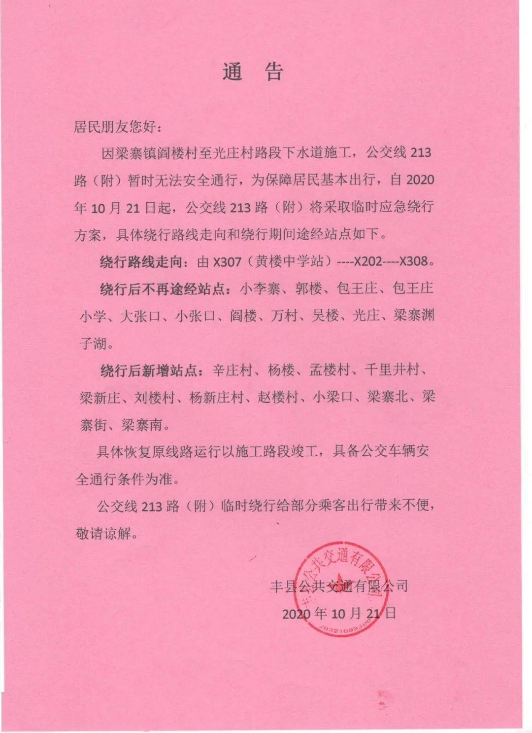 因梁寨镇阎楼村至光庄村路段下水道施工,公交线213路(附)暂时无法安全通行,为保障居民基本出行,自2020年10月21日起,公交线213路(附)将采取临时应急绕行方案,具体绕行路线走向和绕行期间途经站点如下。