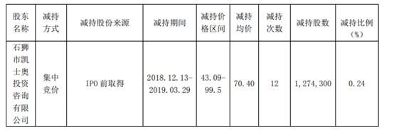 公司公告称,凯士奥在2018.12.13- 2019.03.29期间减持了127.4万股,减持均价为70.4元,此次减持了近9000万元,减持比例为0.24%。而自公司股票首次公开发行之日起,凯士奥已累计减持公司股份 26,674,828 股,占公司总股本比例的 4.96%。