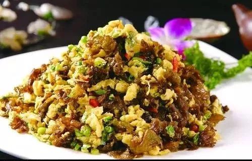 地皮菜是什么? 关于地皮菜的相关知识。 地皮菜是什么? 地皮菜又名地耳、地木耳、天仙菜、珠藻、地皮菜等,是真菌和光合生物之间稳定而又互利的联合体,一般生长在阴暗潮湿的地方。地皮菜呈暗黑色,与泡软的黑木耳有点相似。地皮菜不仅含有丰富的营养,还有药用作用,是一种寒性食品。 每100克含蛋白质15克,高于鸡蛋、木耳、银耳等,总氨基酸含量也高于木耳、猴头,另外含脂肪0.2克,碳水化合物51.2克,粗纤维3.9克、钙406毫克、磷157毫克。铁290毫克,均显著高于其他藻类,是儿童缺钙症的补充食物,对人体补铁养血也极为有利。 地皮菜还含有多种维生素,其中维生素C是紫菜含量的19倍,此外尚含有海藻糖,蔗糖,半乳糖葡萄糖、果糖、木糖、甘露醇、山梨醇等多种营养成分。 1.降脂明目:地皮菜是一种很好的低脂肪营养保健菜,能降脂减肥,同时,对目赤、夜盲、脱肛等病症也有一定疗效。 2.清热降火:地皮菜性寒而滑,具有清热解毒的功效,内服外用,可辅助治疗烧伤、烫伤及疮疡肿毒。 3.补充营养:地皮菜含有丰富的蛋白质、钙、磷、铁等,可为人体提供多种营养成分,具有补虚益气,滋养肝肾的作用。 1.凉拌地皮菜:新鲜地皮菜250克,葱花适量。将地皮菜洗净,去杂,入沸水锅内焯一下,捞出沥水,装盘,加入精盐、酱油、葱花等,再淋上麻油拌匀即可。此肴具有清热明目的功效,适用于目赤红肿,夜盲,久痢等病症。 2.地皮菜豆腐:地皮菜10克,豆腐200克,香葱适量。先将地皮菜洗净;豆腐切小块入锅煮片刻捞出;锅中烧油,煸香葱花,入豆腐、精盐和适量水煮沸,最后加地皮菜炖至入味出锅。此肴具有清热益气,和中的功效,可辅助治疗脱肛病症。 3.地皮菜炒韭菜:地皮菜100克,韭菜25克。地皮菜、韭菜各洗净,沥干水;锅烧热放油。至油热投入地皮菜煸炒,将适量精盐,入味出锅待用;韭英(切段),入锅煸炒,加盐入味,再倒入地皮菜焖炒数分钟即可装盘。此肴具有益气补肾的功效,可辅助治疗脱肛.阳痿遗精,子宫脱垂等病症。 4.地皮菜烧肉鲜:地皮菜200克,猪肉15克,姜、葱各适量。将地皮菜去杂洗净,猪肉洗净切片;锅烧热,投人猪肉片煸炒至水干,加入姜、葱、料酒、酱油煸炒,至肉熟透,再人精盐、白糖烧片刻,放人地皮菜和适量水,烧至人味,投少许味精即成。此菜具有补中益气的功效,适用于体倦乏力,脱肛,阴虚干咳,便秘等病症。 乐夫松 bbs.tianya.cn/post-consumer-57912-1.shtml