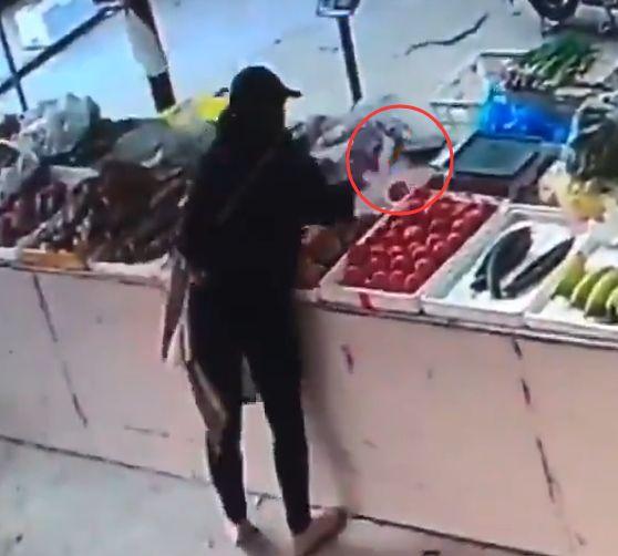 在菜场录像中,记者看到, 一女子戴着口罩,手上搭着一件外套, 先后两次来到该摊位前,佯装买菜。 就在她装着挑选菜品时, 手突然伸到电子秤旁边, 很麻利地将摊主手机拿到手中, 然后迅速离开。