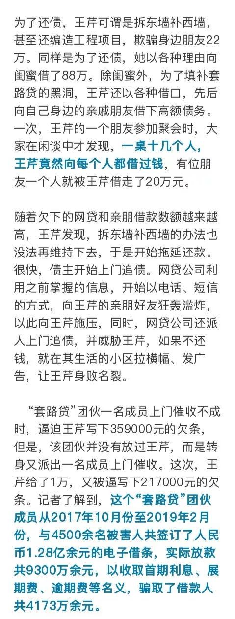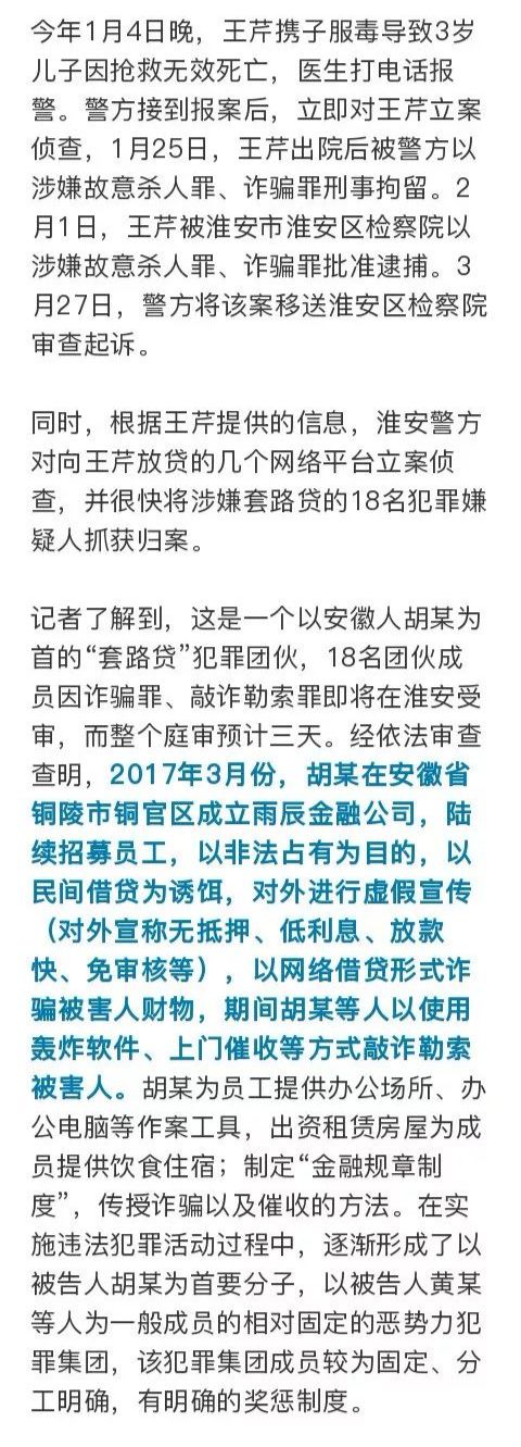 对于淮安女子王芹(化名)的朋友来说,他们想亲眼看看这个害得王芹家破人亡的“套路贷”团伙18名成员长啥样。 因为这个团伙逼得王芹在今年1月4日携自己3岁儿子服毒,导致儿子死亡,虽然王芹侥幸地活了下来,但是她本人涉嫌故意杀人罪、诈骗罪,身陷囹圄。 朋友圈的光鲜背后是… 今年28岁的王芹,出生于一个普通农村家庭,父母常年在外打工。中专毕业后,王芹成为淮安某医院的一名合同制护士。在外人眼里,王芹拥有一个幸福美满的家庭:丈夫是个个体户,有个活泼可爱的3岁儿子。 除此之外,外人也很羡慕王芹的“富有”:在微信朋友圈里,朋友发现,王芹儿子穿的衣服都是名牌,一件羽绒服都是两三千,穿的裤子也要一千多。而王芹在朋友圈晒的化妆品都是国际名牌,其中她用的一个某品牌的化妆品,一套价格就是三万多。由此,在熟悉王芹的朋友同事眼里,王芹是个家庭经济阔绰的人。 但是,只有王芹自己知道,这一切表面风光的背后,是她身背“套路贷”的巨额欠款:从2017年12月底到2018年9月,自己虽然从“套路贷”团伙成员手中实际拿到了30万左右的现金,但自己欠的网贷却高达200多万元。为了偿还这笔高利贷,她骗了亲朋好友100多万,但是,却怎么也还不完。而此时的她因为被逼债还贷,丈夫要与她离婚,她本人也已带着儿子在外租房居住。 套路贷成员的威逼恐吓,无力偿还巨额高利贷的现实让王芹亲手制造了一起人间惨剧:今年1月4日晚,她留下一份遗书后,与儿子先后喝下8瓶毒性很强的农药,导致儿子中毒死亡,而她本人则侥幸地活了下来。 为还网贷借遍亲朋好友, 网贷却怎么也还不完 18名团伙成员即将受审 在这里也提醒大家珍爱生命,远离套路贷 来源:扬子晚报(ID:yzwb20102806)