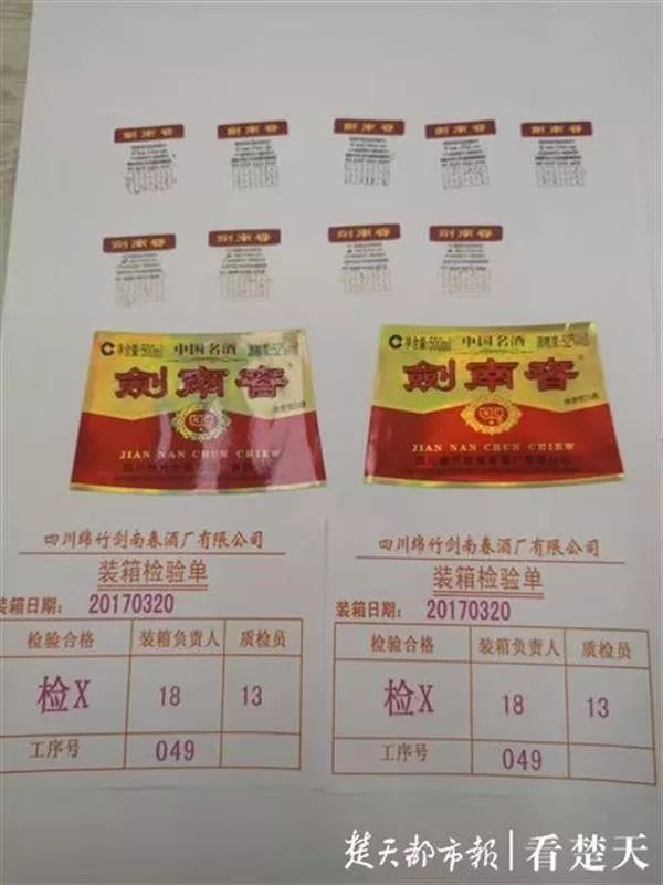 回收的旧酒瓶没有消毒,再“以次充好”! 嫌疑人彭某义等人交代,他们会根据市场需求,通过网络渠道成批采购不同品牌白酒的包装盒、标签、飘带、防伪贴、甚至是促销红包二维码;用市场上批发来的1.5元一斤的散酒和8元一瓶的低质白酒勾兑,“以次充好”装灌进五粮液、茅台、剑南春等品牌白酒的瓶中。