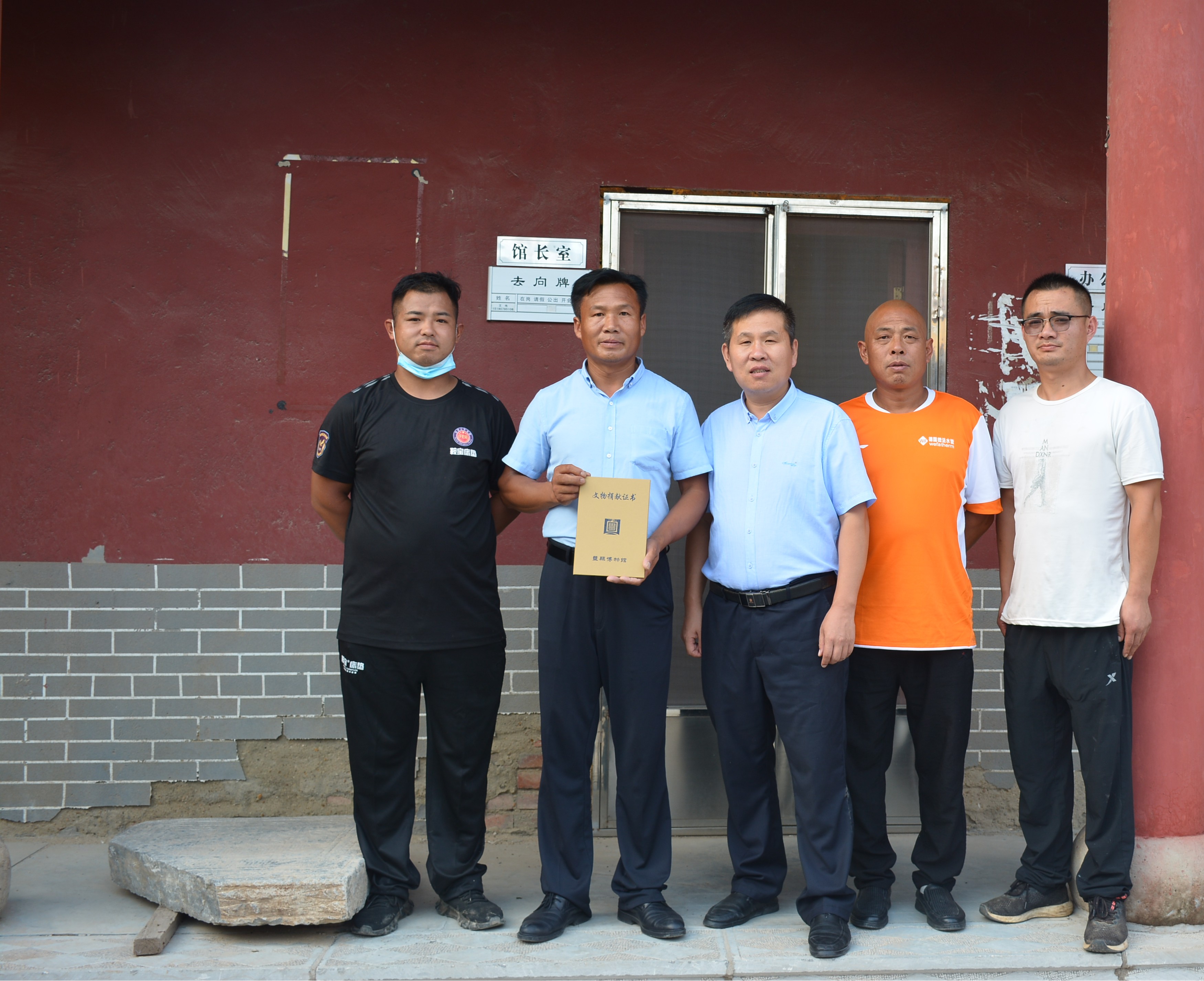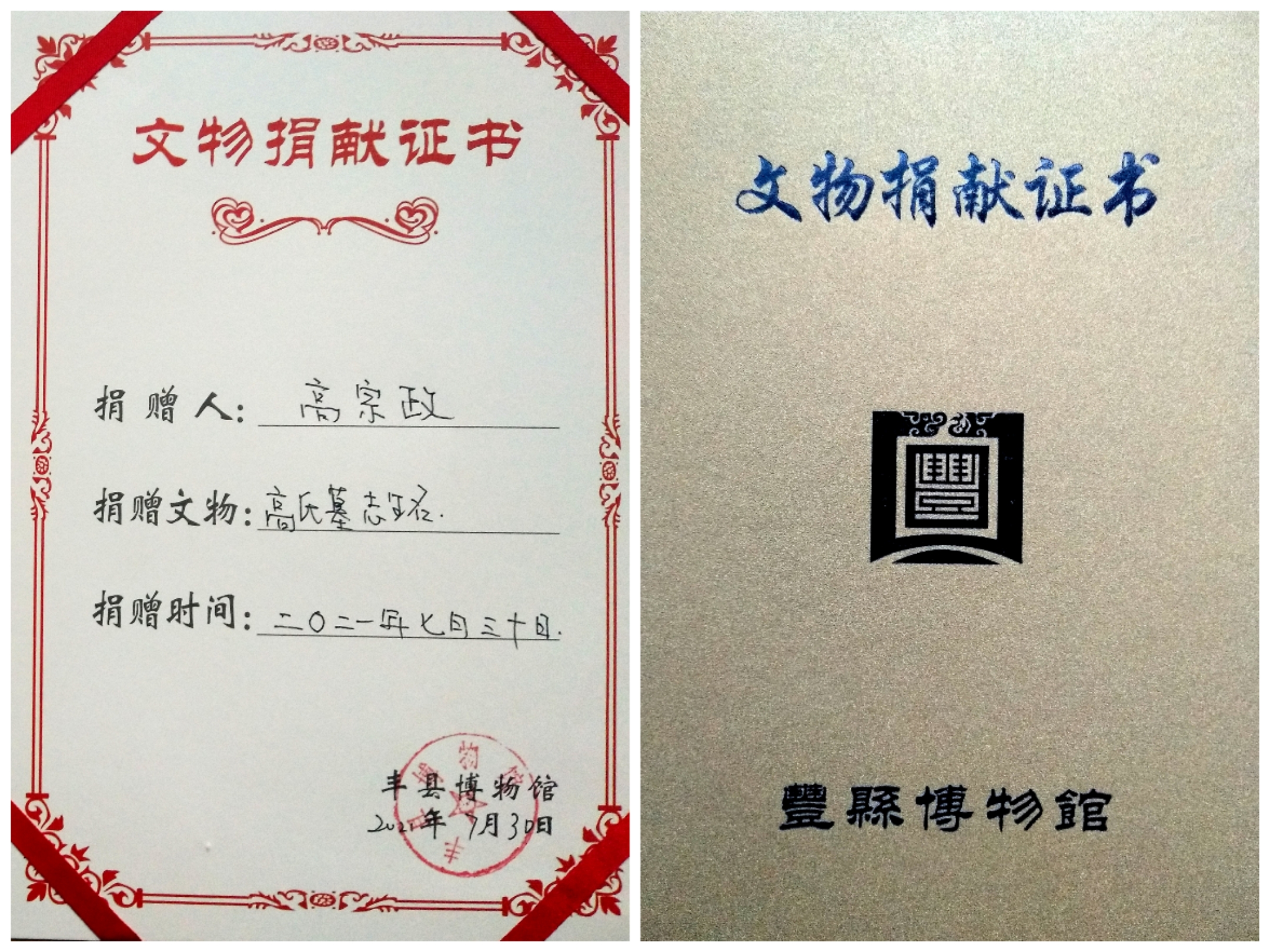 7月30日,丰县赵庄镇青林村高庄高氏家族代表与文物保护热心人一起,将遗留田间的清代康熙年间高氏家族先人墓志铭捐赠给丰县博物馆。